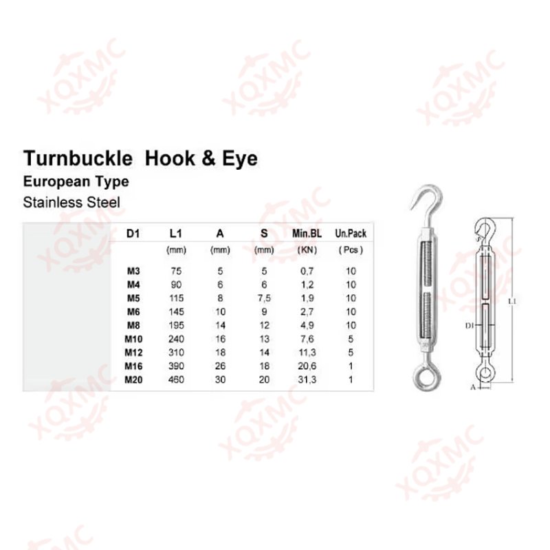 This hook turnbuckle is manufactured in strict compliance with DIN 1480 standards, made from high-quality stainless steel with an optional galvanized finish.